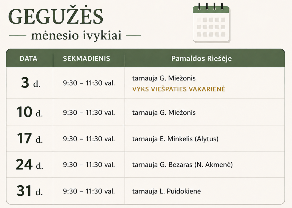 Bažnyčios susirinkimai vyksta: Sekmadieniais 11 val.
