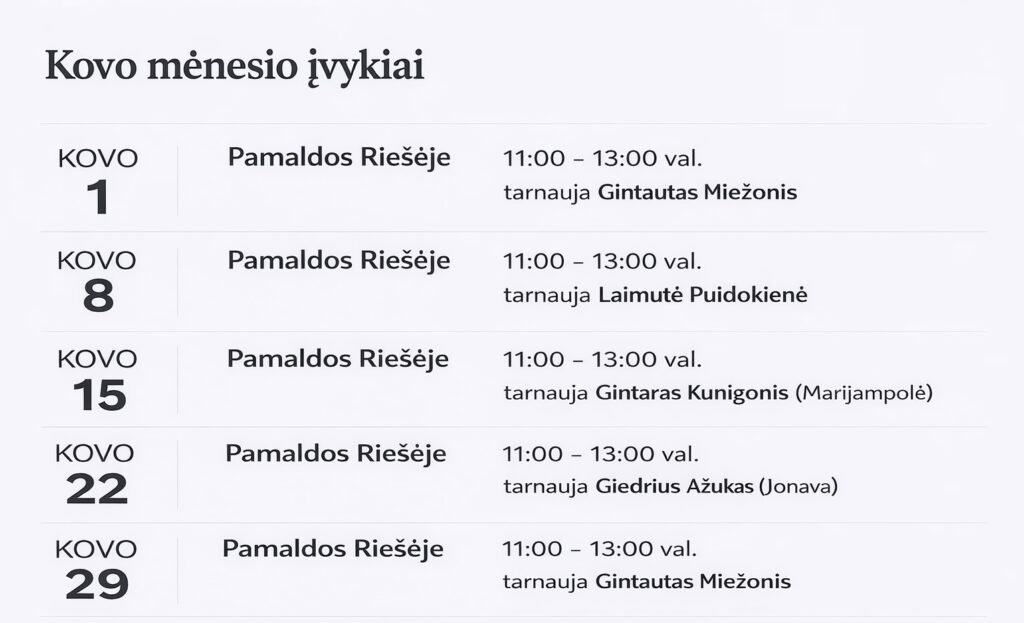 Veiklos ir renginiai Sekmadienio susirinkimai Bažnyčios susirinkimai vyksta: Sekmadieniais 11 val.Riešės bendruomenės namai,Sporto g. 3, Riešė,Vilniaus raj. 14265 Kontaktai Renginiai 2025.11.13Būkime gražūs ne tik vidumi, bet ir išore!Kiekvienais metais Riešės krikščionys renkasi į talką tvarkyti Riešės bendruomenės namus ir aplink esančią teritoriją. Smagu prisidėti prie aktyvios Riešės bendruomenės veiklos ir būti jos dalimi. Būkime gražūs ne tik vidumi, bet ir išore!!Žiūrėti nuotraukų galeriją 2025.10.26Mums 5-eri!!!Laikas greitai bėga ir atrodo tik vakar pradėjome tarnauti Riešėje. O kiek daug visko įvyko.Skaitykite daugiau